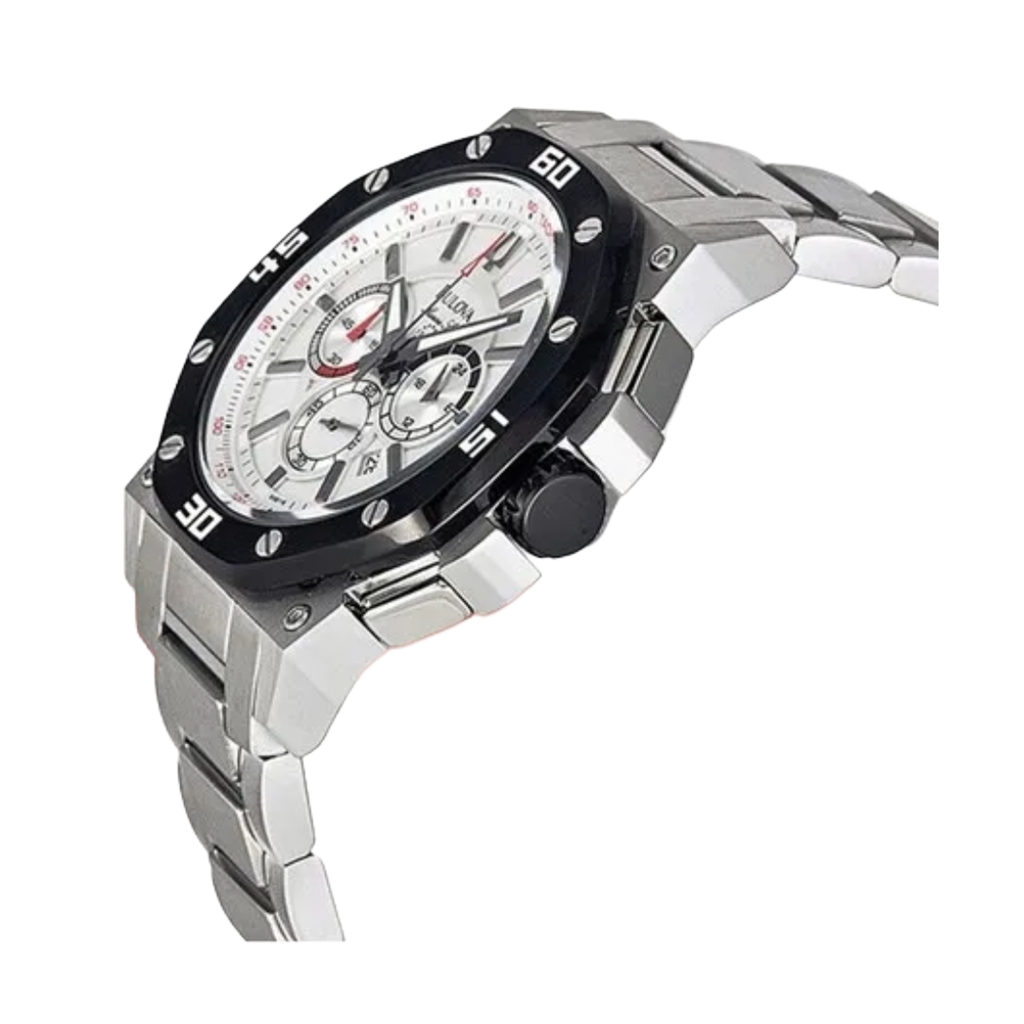 – Esfera blanca con función de cronógrafo, pantalla de fecha y agujas luminosas.