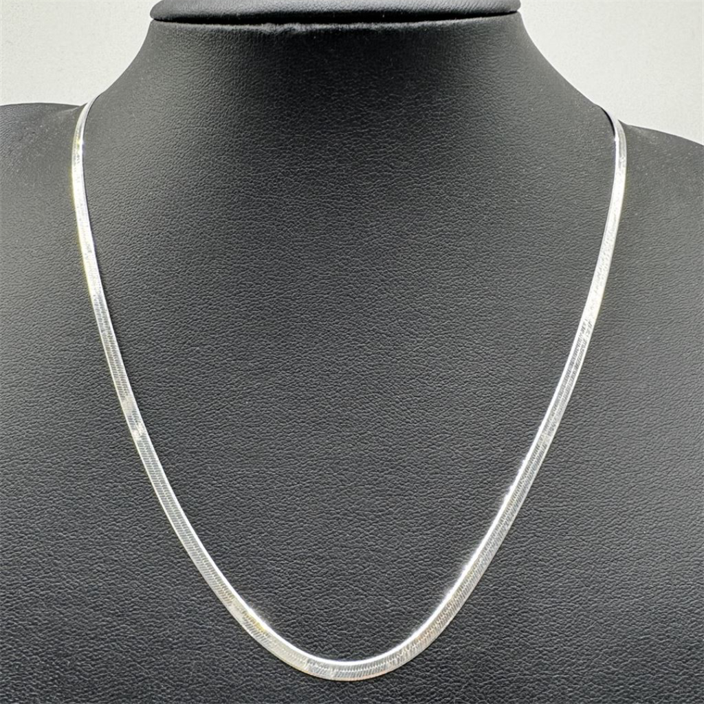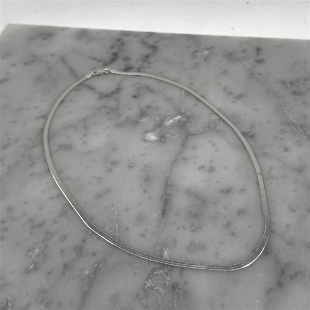 Esta cadena tipo cinta en plata 925 se caracteriza por su diseño plano y elegante, que refleja la luz con sutileza y aporta un toque moderno y sofisticado. Es una pieza delicada pero con presencia, ideal para usar sola o combinar con otros collares y dijes.
