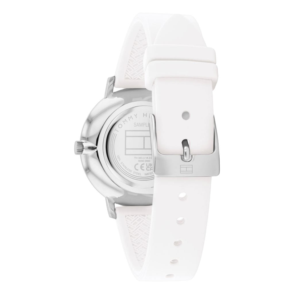 – Correa de silicona blanca, resistente y fácil de llevar.